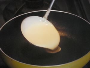 フライパンに薄く生地を引いて、焼いていく。