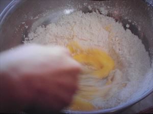卵2個を解きほぐして、粉のくぼみに流し入れ、泡立て器で混ぜ合わせる